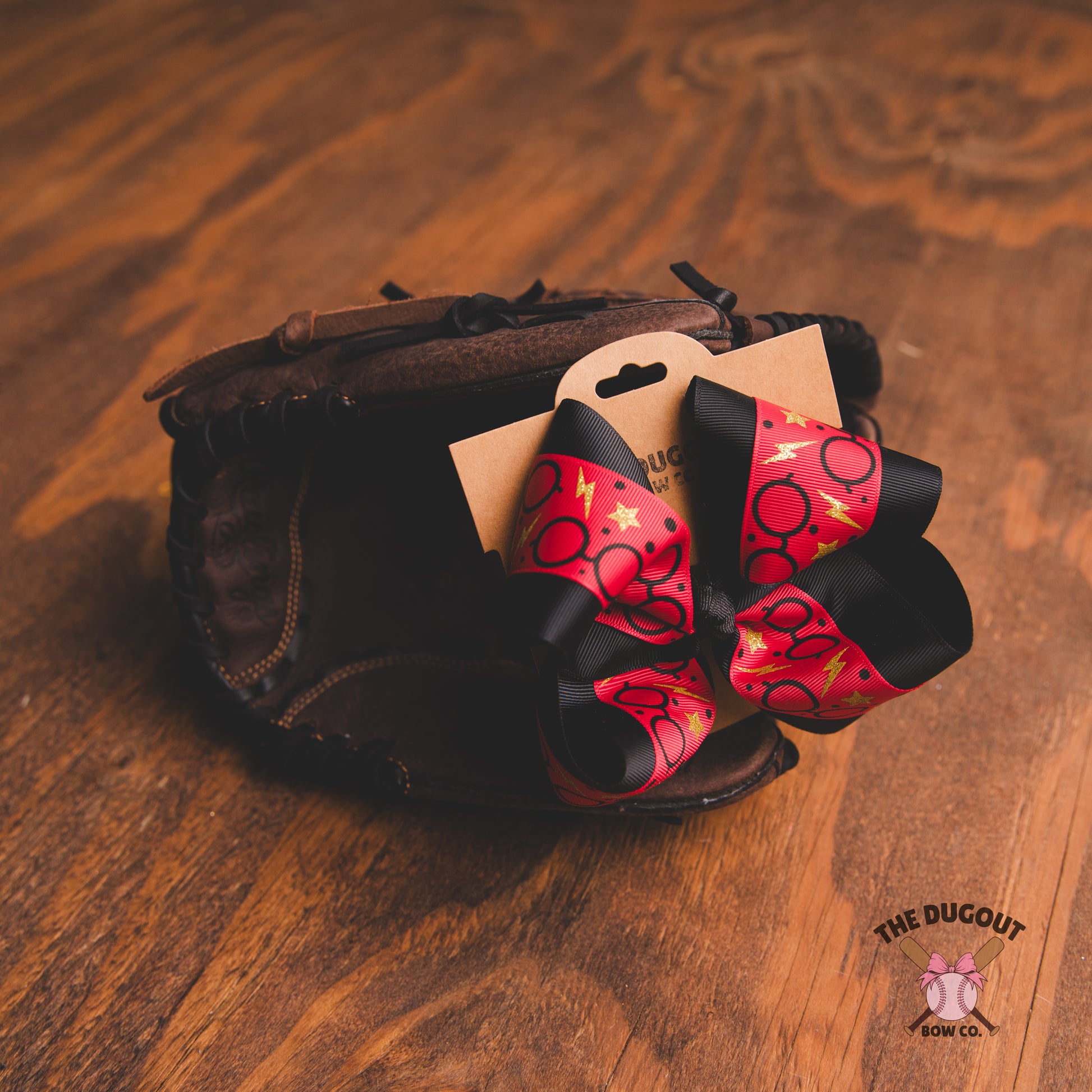 These Gryffindor Bows  are inspired by our favorite scarlet-and-gold house — perfect for game days, book lovers, or anyone who’s ever dreamed of catching a golden snitch between innings. Made from durable grosgrain ribbon with deep red and black tones, lightning bolts, glasses, and spellbook details, this bow is a total showstopper on or off the field.