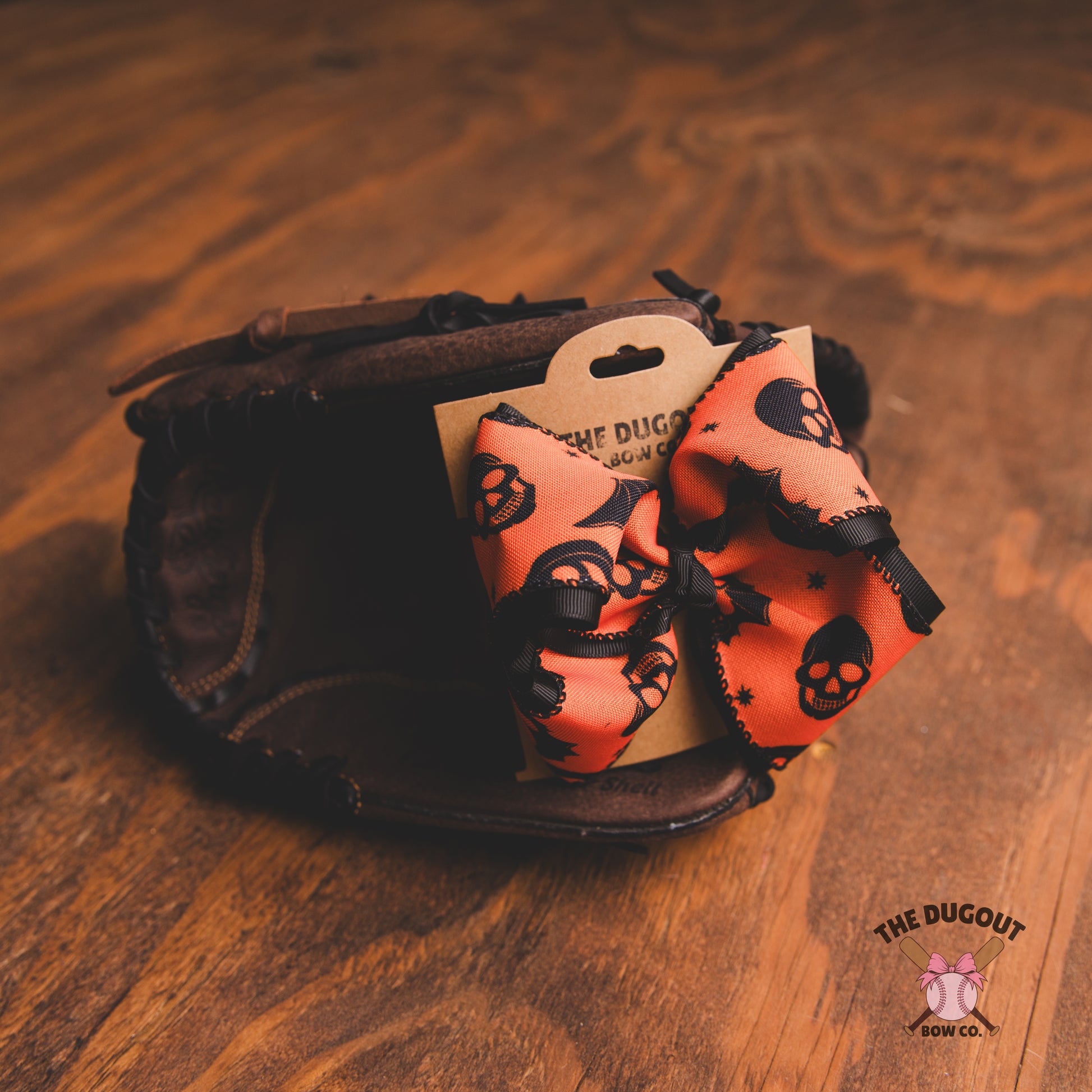 The Bat to the Bone Bow is a Halloween home run — featuring bright orange ribbon covered in skulls, bats, and stars. Choose between a sleek ribbon center or add some extra fright-night flair with the glittery bat charm. Either way, this bow brings major boo energy to your game-day or fall fit.