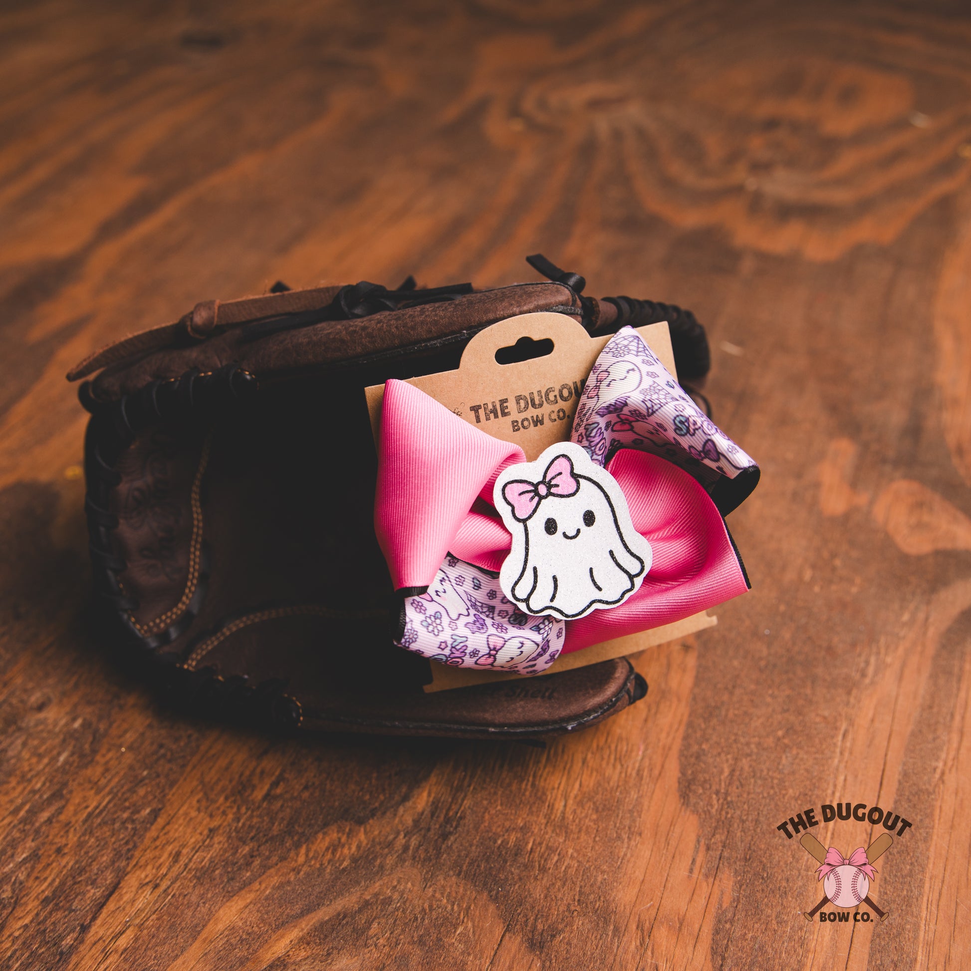 Featuring a pink-and-purple ghost print, this bow comes in two adorable styles ā one with a simple ribbon center and one topped with a ghost charm for that extra pop of personality. Perfect for little ghouls, game-day babes, and anyone who loves a hint of pink in their spooky season style.
