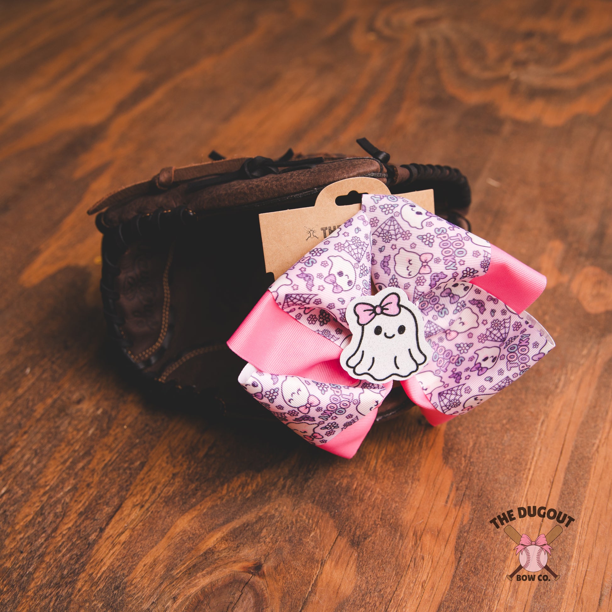 This XXL Too Spooky Bow is a soft pink twist on classic Halloween — featuring an adorable ghost print, bubblegum accents, and a removable ghost center clip that can be worn solo or swapped onto other bows! It’s the perfect mix of cute and clever for your little bleacher babe, cheerleader, or ghost-loving girly.