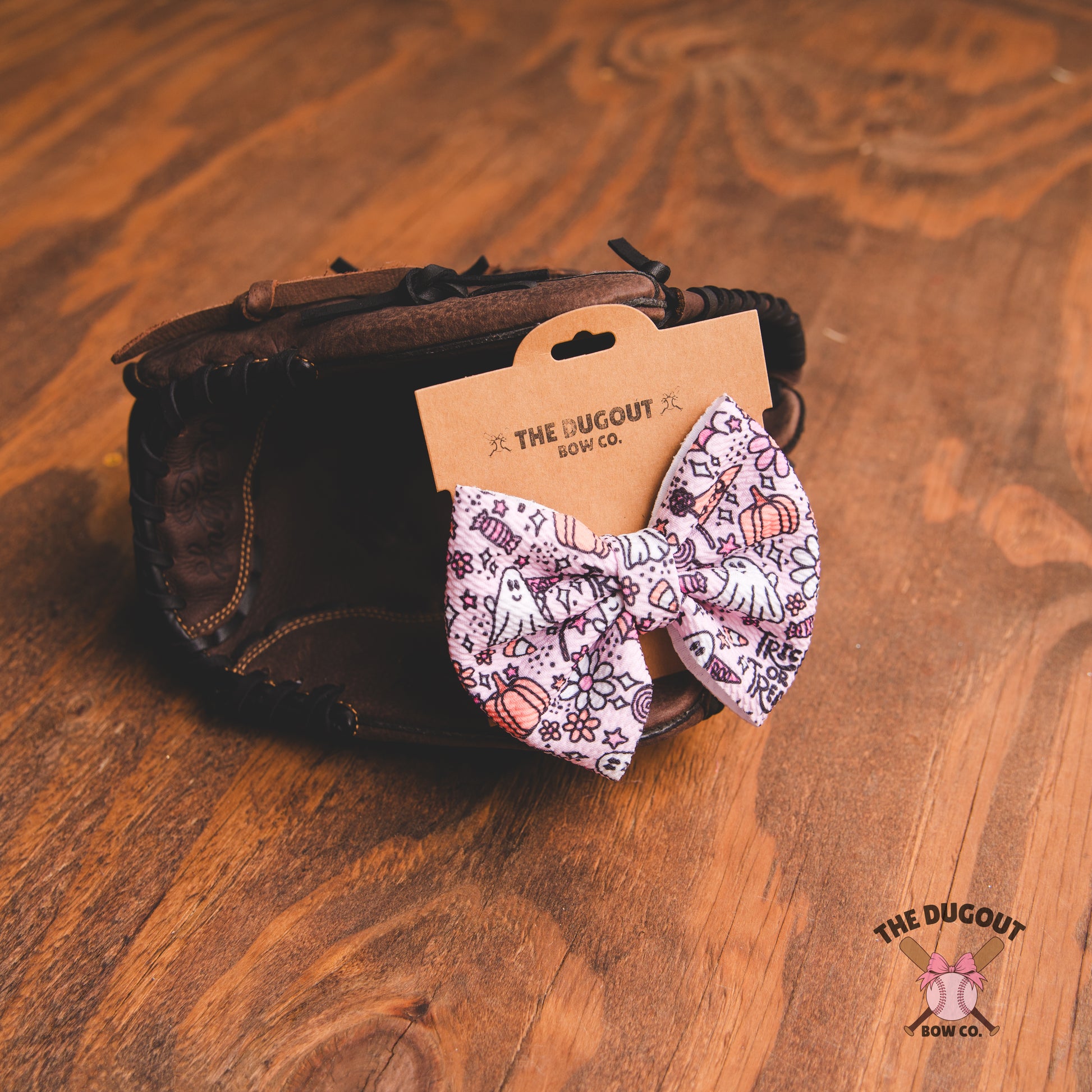 This the perfect mix of ghostly charm and fall florals β featuring sweet little ghosts, pumpkins, and flowers on a soft pink base. Handmade and attached to a sturdy alligator clip, this bow is ready to haunt the sidelines (in the best way).